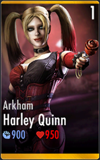 - While she is simply titled "Arkham", she is clearly based on the version of Harley Quinn in Batman: Arkham City, which is also the only Arkham skin in console - while she interacts with Arkham Origins characters, she wasn't Harley Quinn yet in Batman: Arkham Origins. She is also listed as "Arkham City" in the console version of Injustice.