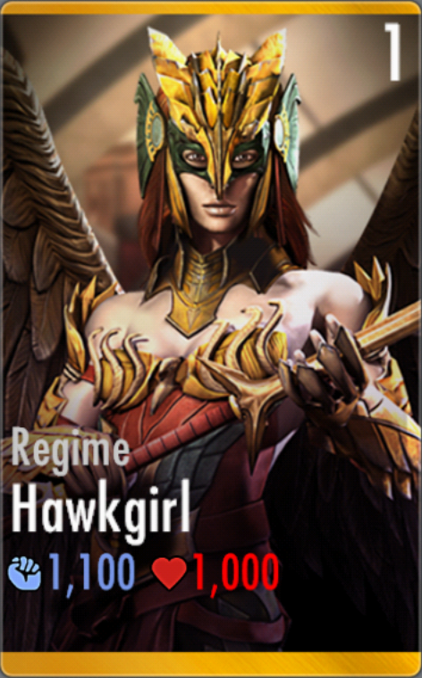 Regime Hawkgirl is a valuable defensive asset to the team that can reduce the threat from the enemy team by disabling their specials, especially from those are immune to power drain, as well as deal heavy damage with her crit SP2.