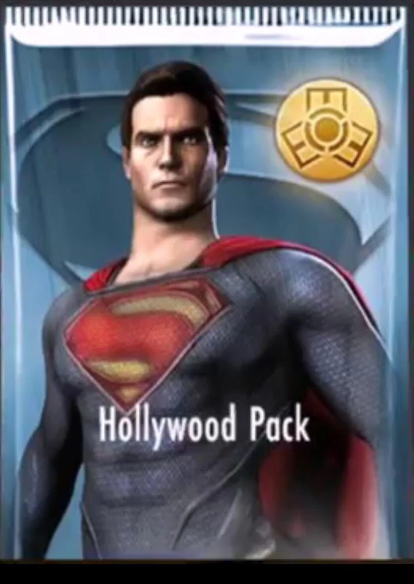 The Hollywood Pack is a new and upcoming pack rumored to be introduced in the 2.12 update. Its contents and cost are currently unknown, but its cover card is Superman/Man of Steel. Its leaked contents are one copy of Superman/Dawn of Justice and 125,000 power credits.