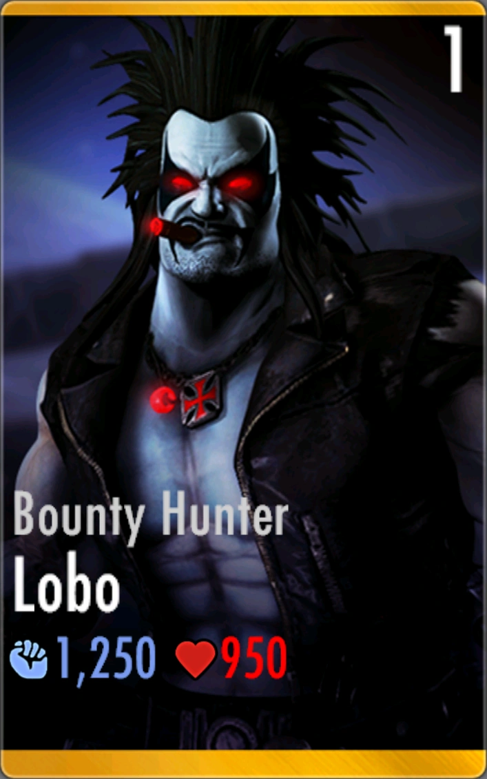 Bounty Hunter Lobo used to be the character with the highest base damage, before being surpassed by Wonder Woman/New 52 at 1300. Previously, he was quite unpopular due to his impractical passive, which theoretically allows him to stack up to large amounts of damage, but took too much power and time to do so. However, he can now be a very deadly character when paired with the Tantu Totem and Ra's al Ghul's Scimitar, allowing him to rain hell upon the opponent.