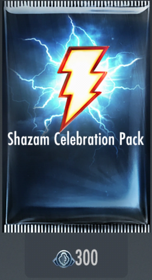 The Shazam Celebration Pack is a booster pack in the game introduced in the 3.2 update before the release of the Shazam film. This pack costs 300 Nth Metal.