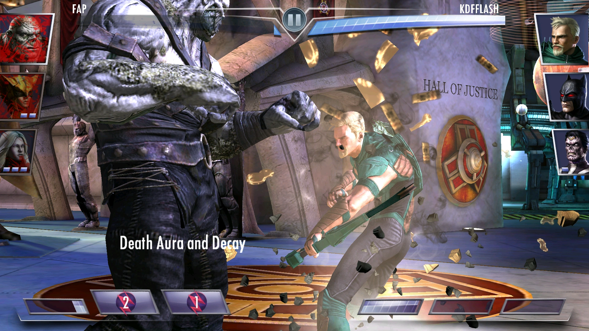 Earth 2 Solomon Grundy is a character that was introduced in the 2.9 update, yet his challenge did not air during the short amount of time the update was current (due to the primacy of the 2.10 update and the Injustice 2 characters). However, up until his initial release near the end of the 2.11 update, he can be fought as an opponent in Superman/Injustice 2's and Aquaman/Injustice 2's challenges, and in certain matches in Survivor Mode as well! In 2.17, he was given a buff to his passive that allows him to dampen his current opponent's power generation, making him the undead behemoth of Earth 2.