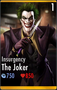 Insurgency Joker can be seen as one of the "starter" gold cards, being a common drop from Gold Booster Packs. While his base stats are one of the lowest in the game and his specials are slow and easily blocked, and that his special 2's bonus damage doesn't actually work and deals greatly reduced upfront damage (encouraging use of his Super Move), he is not without merits: he is readily available, and he has Joker's typical 4-hit heavy combo (giving him a bit more damage and power generation compared to old cards with standard combos). If all else fails, he works as an excellent throwaway character for tough nightmare challenge battles or bosses in later Standard Battle areas.